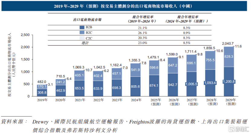 随着经济及跨境电商的进一步发展,于2029年,中国出口电商物流市场的收入预计将达到约2.04万亿元,2024年至2029年的复合年增长率为8.5%。