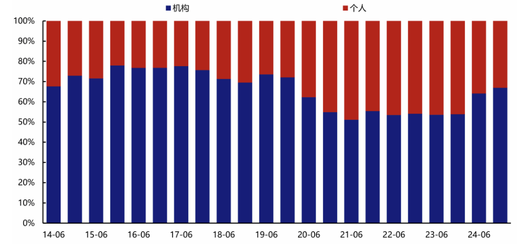 截至24年末,根据已披露的股票型ETF持有人信息,个人投资者占比为33.1%,而机构投资者占比为66.9%,较23年末提升13.1%。