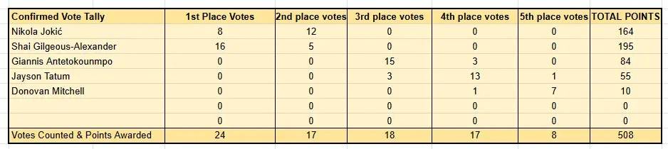 目前有24位投票人公布了自己的MVP票选情况。在这24人中,16人将MVP第一选票投给了亚历山大,8人投给了约基奇,其他无人获得第一选票。