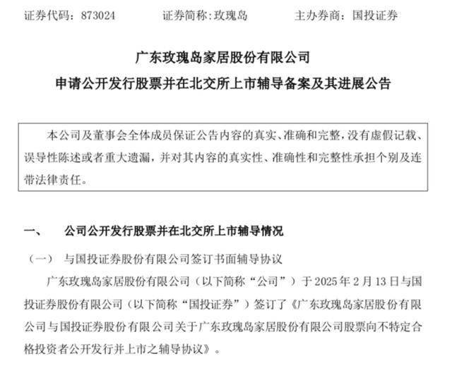 乐居财经严明会 近日,广东玫瑰岛家居股份有限公司(以下简称:玫瑰岛)在广东证监局完成IPO辅导备案,拟北交所IPO,辅导机构国投证券。