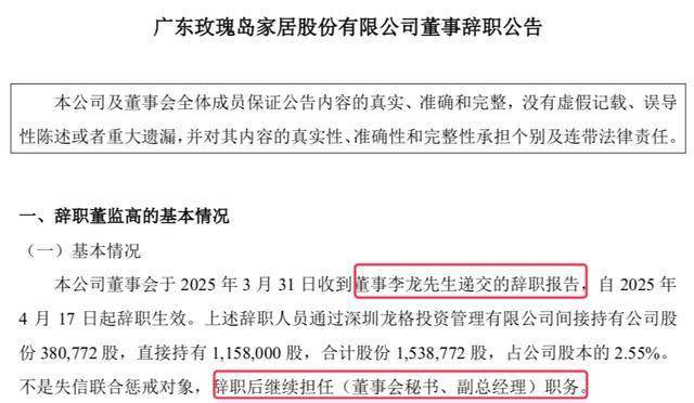 2025年3月31日,李龙辞任公司董事,辞职后继续担任董事会秘书、副总经理职务。
