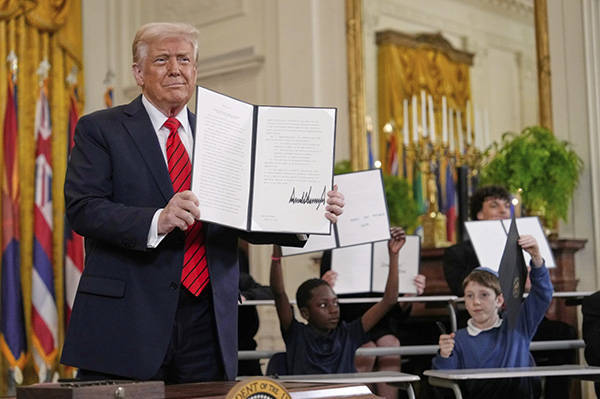 当地时间3月20日,特朗普展示已签署的行政令。美联社