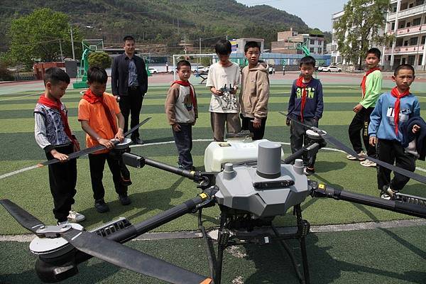 2025年4月3日,广西来宾,忻城县欧洞乡小学,小朋友近距离接触无人机。视觉中国
