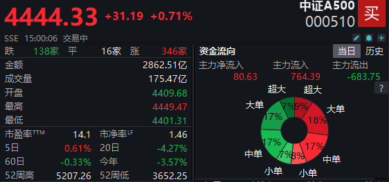 中证A500指数(000510.CSI)小幅上涨0.71%,收报4444.33点。成分股中,有346家上涨,利亚德(300296.SZ)、光线传媒(300251.SZ)等5只个股涨停或涨超10%。