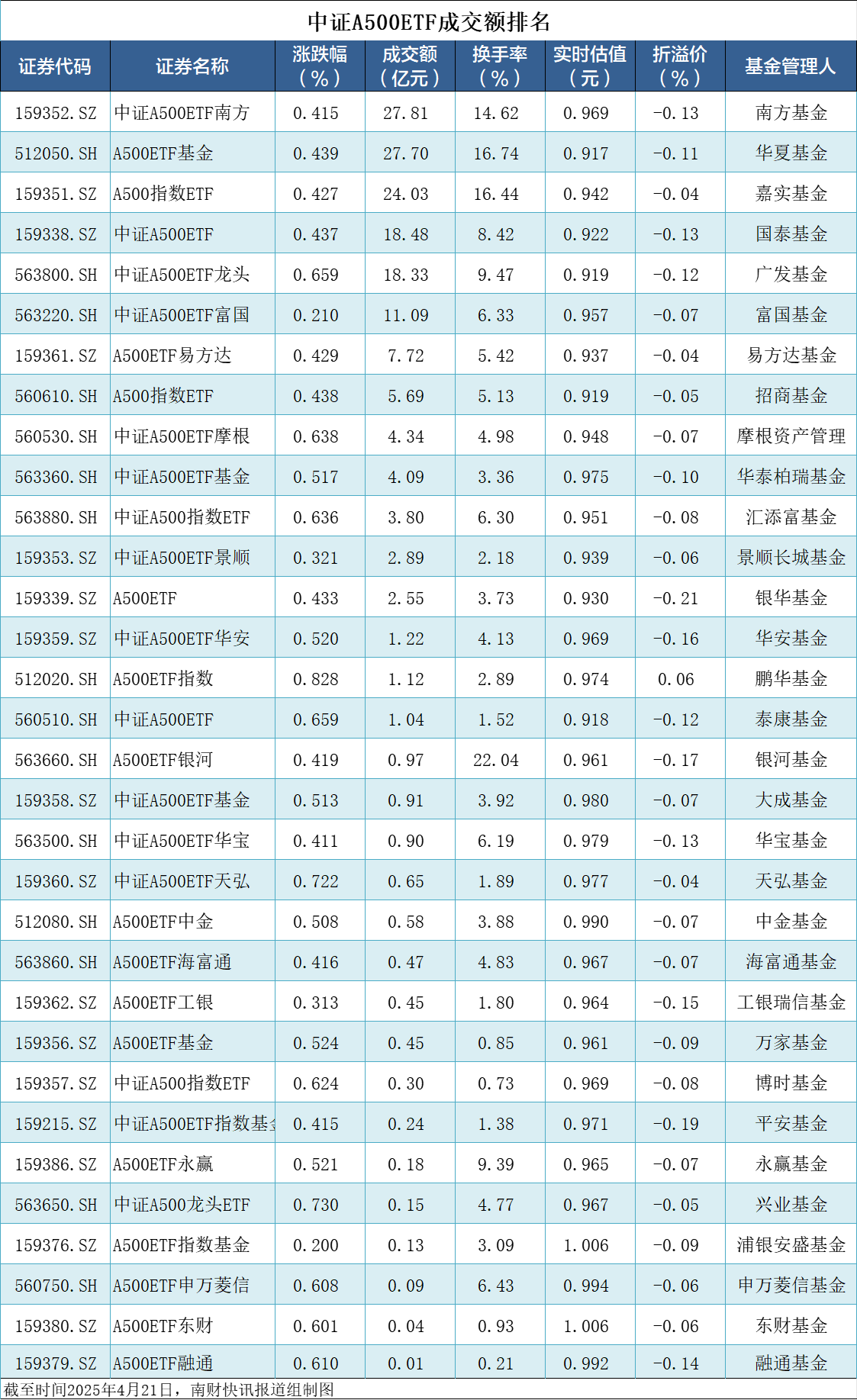 紧跟指数走势,32只中证A500ETF集体收涨。其中,鹏华A500ETF指数上涨0.828%,涨幅最大;成交额方面,中证A500ETF合计168.42亿元。南方中证A500ETF成交额27.81亿元,排名第一。