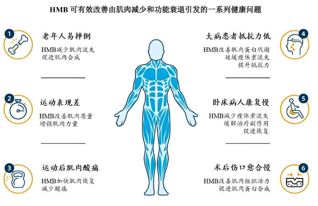 其中,HMB又叫β-羟基-β-甲基丁酸,是人体必需的支链氨基酸亮氨酸的活性代谢产物,能促进蛋白质合成并减少其分解,从而增加人的机体力量,延缓肌肉疲劳,也有助于防止老年人的肌肉萎缩,改善人体健康和生活状态,提升机体功能和生活自理能力,并具有加速康复及促进伤口愈合等作用。