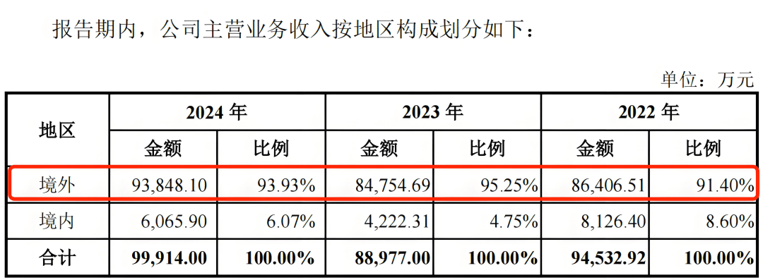 招股书显示,技源集团的主要销售收入来源于境外。报告期内,境外收入占主营业务收入的比例高达91.40%、95.25%和93.93%,境外销售地区主要包括美国、欧洲、澳大利亚、亚洲(中国大陆以外)、南美等国家或地区。可见,技源集团较为依赖境外市场。