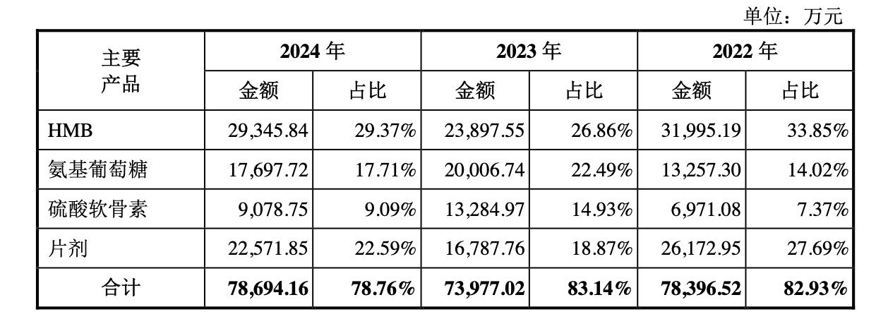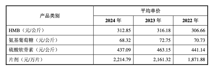 除了HMB外,技源集团主营业务还包括氨基葡萄糖(下称“氨糖”)及硫酸软骨素。虽然公司2024年毛利率有所上升,但实际上技源集团大部分产品的单价2024年均同比下降。