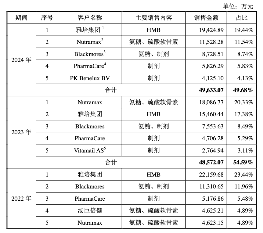 美国是技源集团最主要的销售地区,占公司总营收超三成。公司前五大客户中,雅培集团及Butramax均是美国膳食营养企业。根据招股书,技源集团面向美国市场主要销售HMB、氨糖等营养原料产品,2022-2024年合计销售金额占公司营业收入的比例分别为20.87%、36.43%和30.57%。