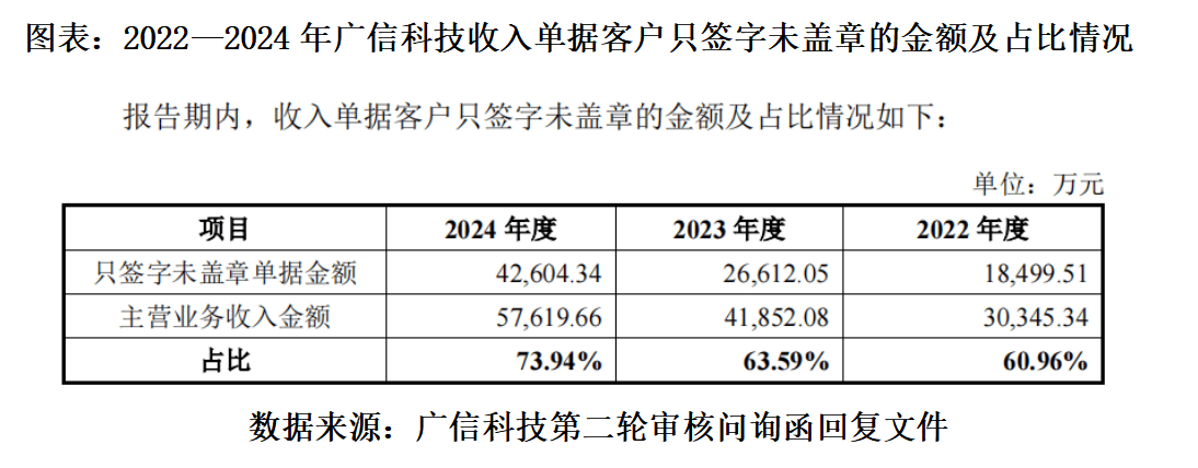 2022—2024年,广信科技的主营业务收入中分别有60.96%、63.59%、73.94%的收入确认单据为只签字未盖章单据。