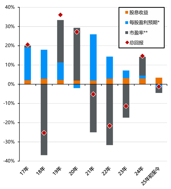 资料来源:沪深证券交易所,万得,摩根资产管理。*每股盈利增长预期基于未来12个月盈利一致性预期计算,数据来源于万得。**市盈率为基于未来12个月盈利预测的动态市盈率。过往表现并非当前及未来业绩的可靠指标。《环球市场纵览-中国版》。反映截至2025年3月31日的最新数据