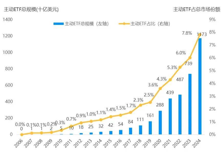 过去的十几年,全球范围内主动ETF经历了高速的发展。2013到2024年的12年间,主动型ETF的管理规模实现了49%的年复合增速,并且突破了1.1万亿美元的管理规模(数据来源:ETFGI,截至2024年12月31日)。根据彭博的数据,2024年全球ETF流入金额中,主动型ETF占到了31%。