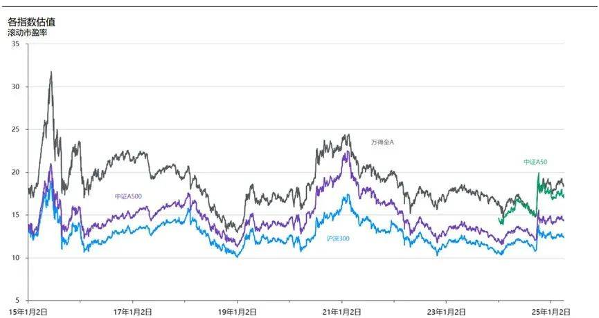 我们再来看主要指数相对历史的估值水平。以沪深300、中证A500、中证A50为代表的核心宽基指数,目前估值处于过去10年一个比较平均的位置,并没有出现显著的高估。而且,随着经济刺激政策开始发挥效应,推动企业的盈利增长,可能会带来估值的下行。