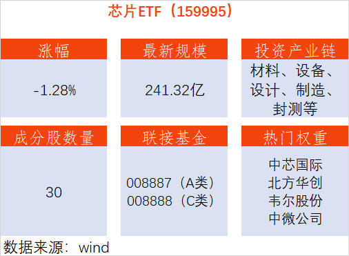 资料显示,芯片ETF(159995)跟踪国证芯片指数,30只成分股集合A股芯片产业中材料、设备、设计、制造、封装和测试等龙头企业,其中包括中芯国际、寒武纪、长电科技、北方华创等。其场外联接基金为,A类:008887;C类:008888。