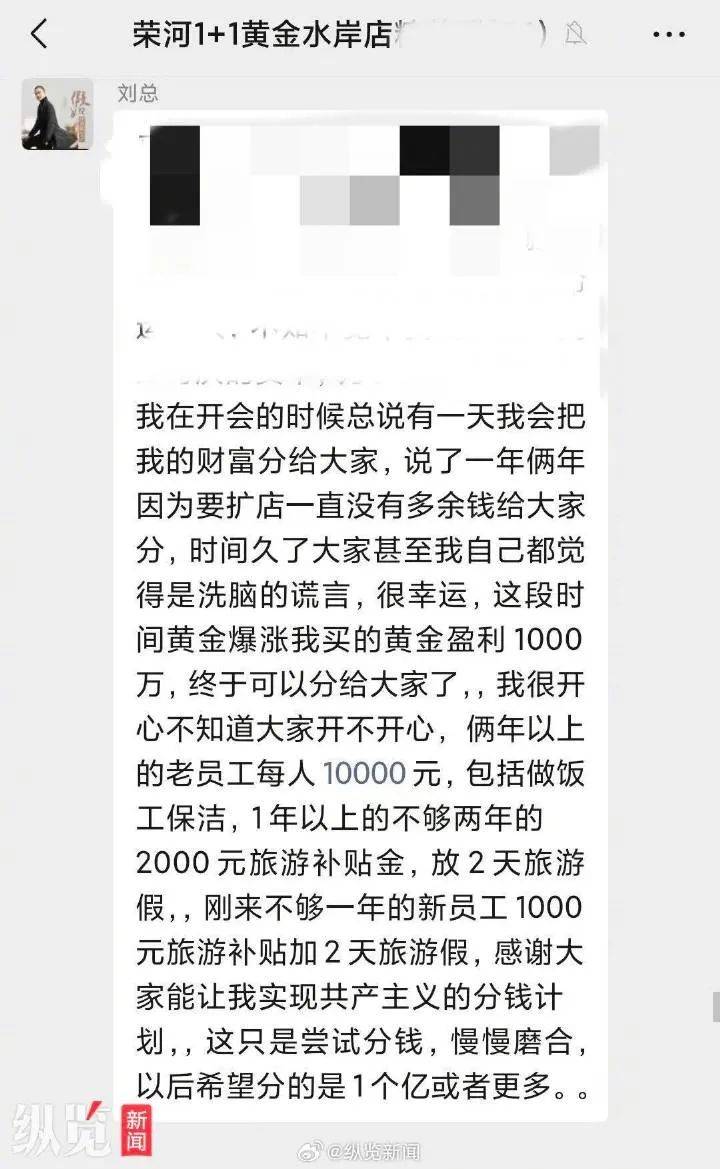截图中还公布了“分钱”标准,两年以上员工每人分10000元,包括做饭工和保洁;一年以上不够两年的分2000元旅游补贴金,放2天旅游假;刚来不够一年的新员工1000元旅游补贴加2天旅游假。