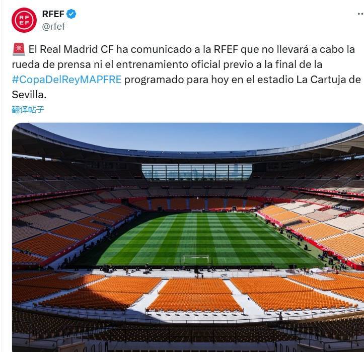 西足协官方公告:皇家马德里俱乐部已经通知西班牙足协,原定于国王杯赛前的新闻发布会将不会进行,俱乐部也不会进行官方训练课。