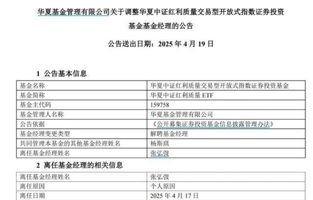 4月19日,华夏基金公告称,因个人原因,张弘弢卸任华夏中证红利质量ETF及其联接基金的基金经理,离任日期为4月17日。这也是继去年11月后,他再次卸任产品,自此,张弘弢已无在管公募产品。