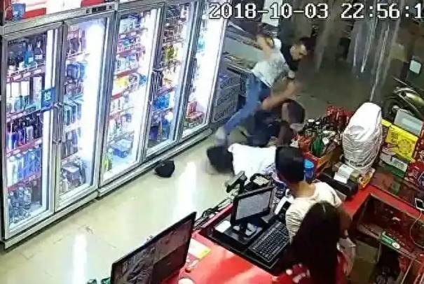 ▲2018年10月3日晚,王某被推入路边便利店殴打的监控视频。图/视频截图