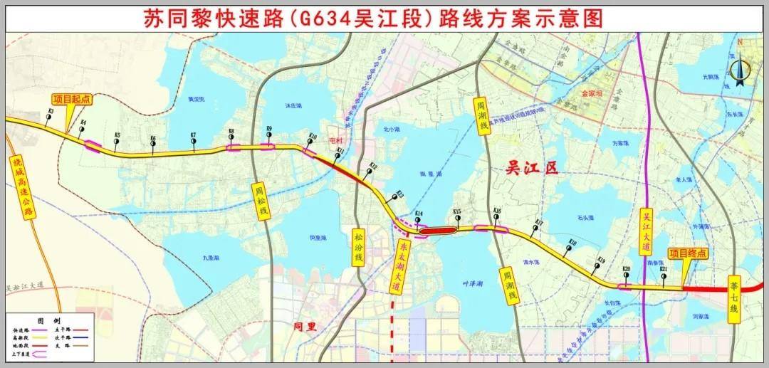 苏同黎快速路(G634吴江段)原属605省道,2024年8月,交通运输部将吴江境内605省道规划调整为634国道。该项目北起吴江与吴中交界处,南至吴江大道南侧,路线全长17.694公里,均为老路改扩建。全线采用一级公路技术标准、“高架+地面”形式,上下均为双向四车道,设计速度80公里/小时。工程自2022年5月6日开工建设,于2025年4月25日通过交工验收,4月26日正式通车。