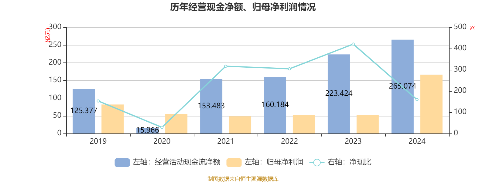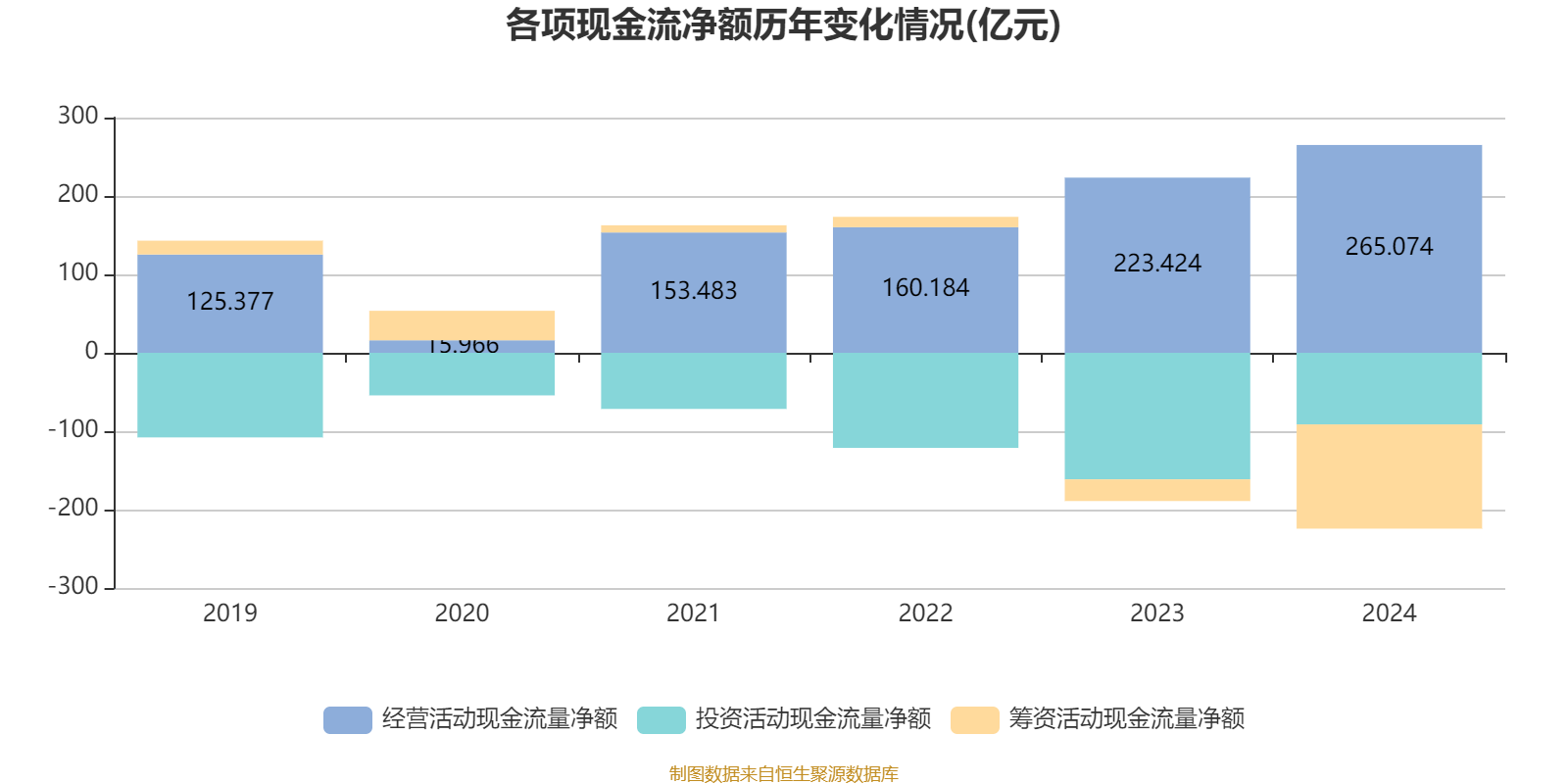 2024年,公司经营活动现金流净额为265.07亿元,同比增长18.64%;筹资活动现金流净额-132.97亿元,同比减少105.33亿元;投资活动现金流净额-91.32亿元,上年同期为-161.45亿元。