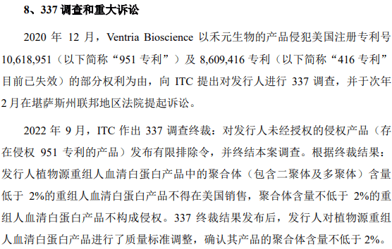但对于公司与Ventria Bioscience的专利诉讼,禾元生物又表示“鉴于诉讼结果可能存在不确定性,可能对公司未来植物源重组人血清白蛋白相关产品在美国市场销售造成不利影响。”