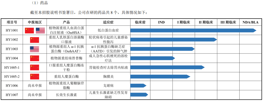 其中,HY1002针对轮状病毒腹泻的口服液,已进入Ⅱ期临床测试阶段,测试中可缩短病程36小时,填补儿童用药的空白;HY1003已获美国FDA孤儿药资格,用于遗传性肺气肿,Ⅰ期肺功能改善率28%,是唯一进入临床的植物源酶替代疗法。