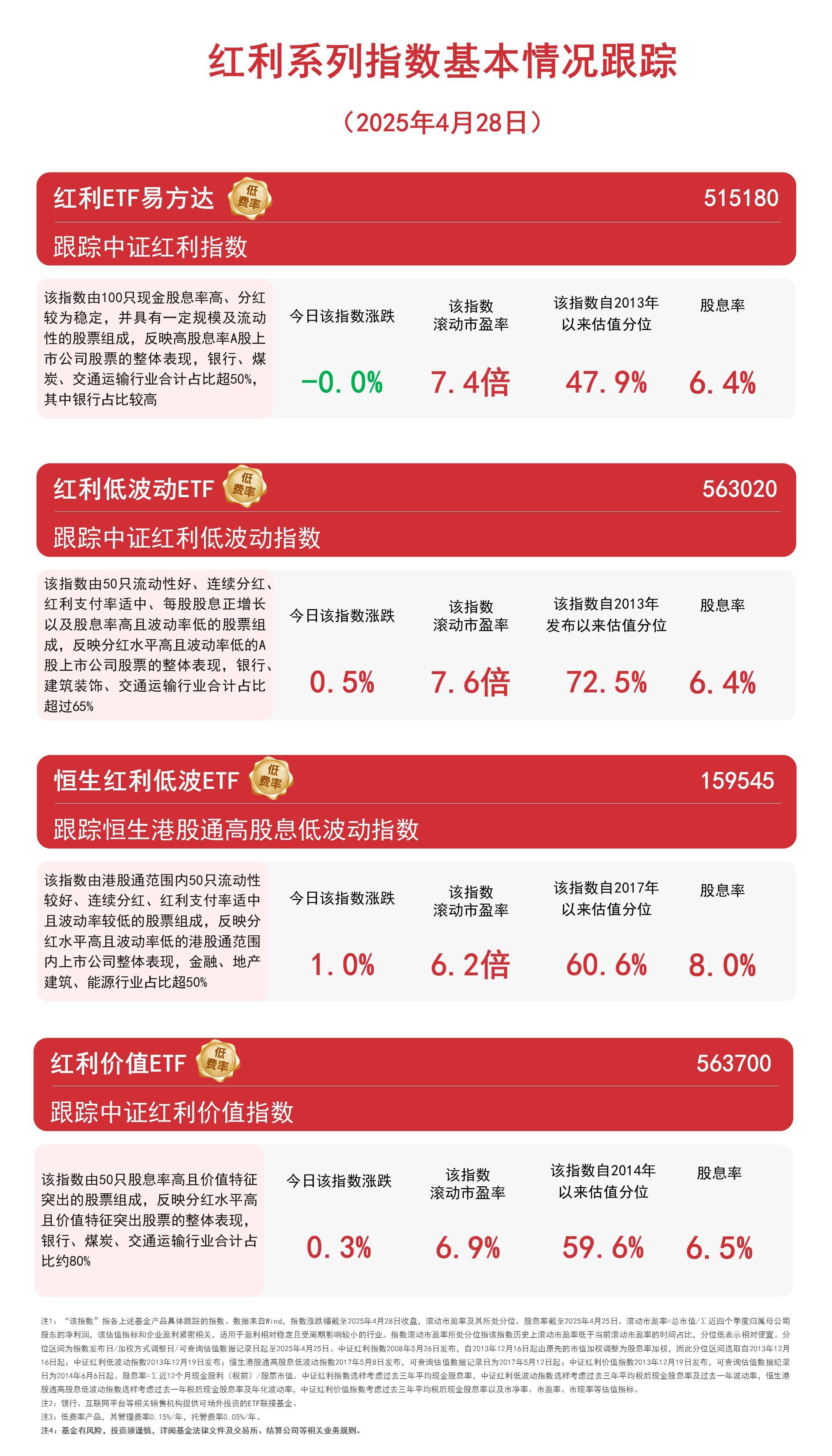 截至收盘,恒生港股通高股息低波动指数上涨1%,中证红利低波动指数上涨0.5%,中证红利价值指数上涨0.3%,中证红利指数下跌0.02%。今日上市的红利价值ETF(563700)交投活跃,全天成交额近1亿元,换手率约26%。