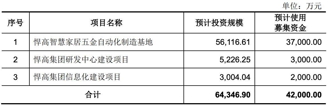 直至2025年4月,悍高集团才迎来上市委会议,并顺利通过。本次报考上市,悍高集团计划募资4.2亿元,将用于悍高智慧家居五金自动化制造基地等。