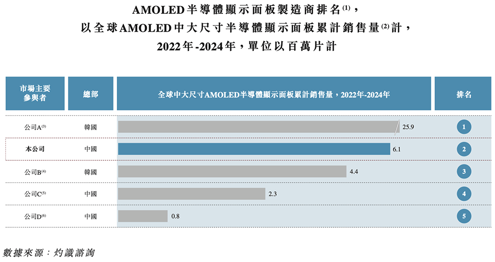 ▲AMOLED半导体显示面板制造商排名,以全球AMOLED重大尺寸半导体显示面板累计销售量计,2022年-2024年,单位以百万片计(数据来源:灼识咨询)