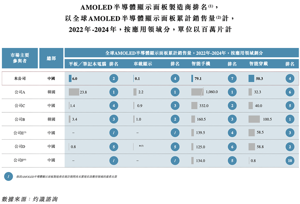 ▲AMOLED半导体显示面板制造商排名,以全球AMOLED重大尺寸半导体显示面板累计销售量计,2022年-2024年,按应用领域分,单位以百万片计(数据来源:灼识咨询)