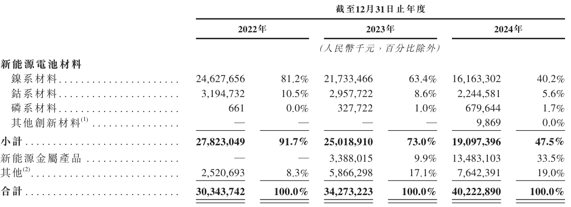 镍系材料是公司营收支柱,2024年贡献161.63亿元,占比40.2%。以镍为主的新能源金属产品爆发式增长,2024年收入134.83亿元,同比暴增近300%,成为增长新引擎,反映了全球新能源需求旺盛。