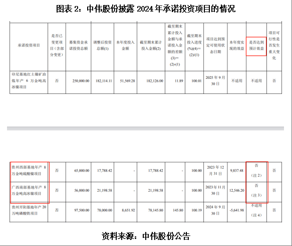 如图表2所示,根据《2024年度募集资金存放与使用情况专项报告》,“贵州西部基地年产8万金吨硫酸镍项目”和“广西南部基地年产8万金吨高冰镍项目”均未达到预计效益。