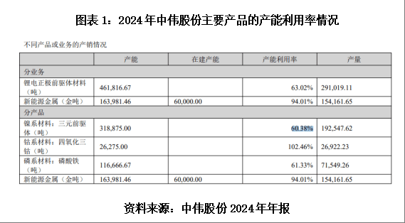 根据中伟股份的年报,2022—2024年,中伟股份的三元前驱体产能利用率分别为98.74%、79.50%、60.38%。2023年和2024年产能利用率下滑明显。
