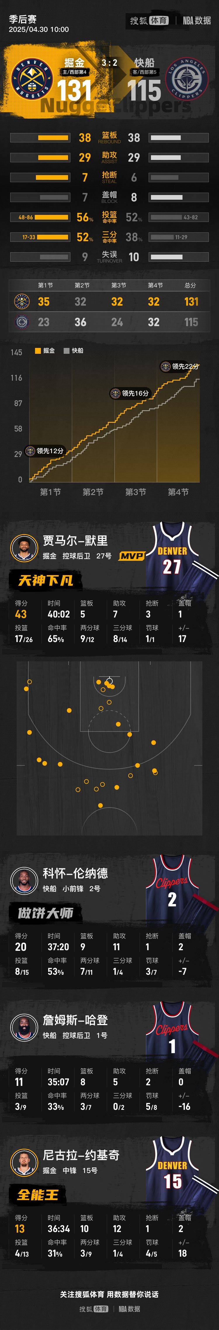 末节,波特三分命中,空接上篮又打成2+1,穆雷干拔三分也中,此时分差已经被拉大到20分了。此后,快船攻势有所回暖,小卡的三分入网,祖巴茨的勾射也进,比分被略微缩近。但接下来奇迹没有上演,掘金稳定的攻防输出守住胜局。最终,全场打完,掘金131-115轻取快船,将系列赛总分改写为3-2,成功拿到赛点。
