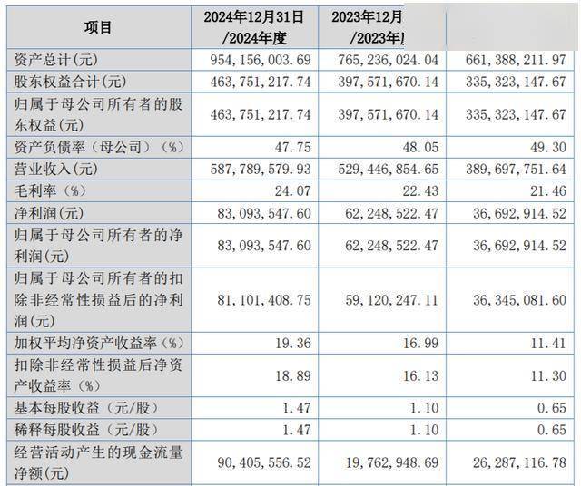 业绩方面,2022年至2024年(报告期内),公司营业收入金额分别为3.90亿元、5.29亿元和5.88亿元;净利润分别为3669.29万元、6224.85万元和8309.35万元。2024年营收净利双增。
