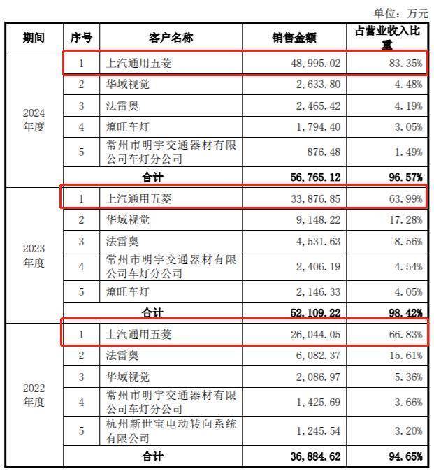 报告期内,公司对前五大客户的销售收入占营业收入的比例分别为94.65%、98.42%和96.57%,客户集中度相对较高,其中第一大客户上汽通用五菱占比分别为66.83%、63.99%和83.35%。