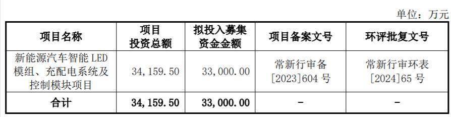 本次IPO,通宝光电拟投入募集资金金额3.3亿元,用于新能源汽车智能LED模组、充配电系统及控制模块项目。
