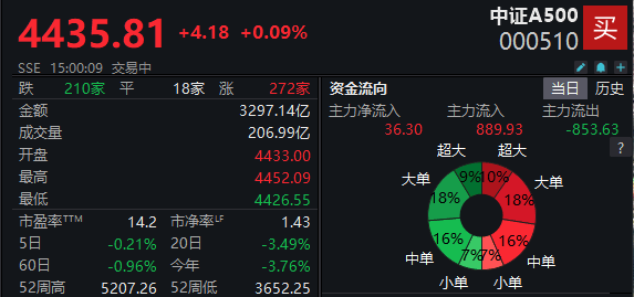 中证A500指数(000510.CSI)微涨0.09%,收报4435.81点。成分股中涨多跌少,有272家上涨,210家下跌,18家收平。该指数本周跌0.17%,本月累跌3.40%。