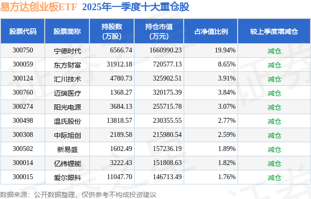 易方达创业板ETF的前十大重仓股如下: