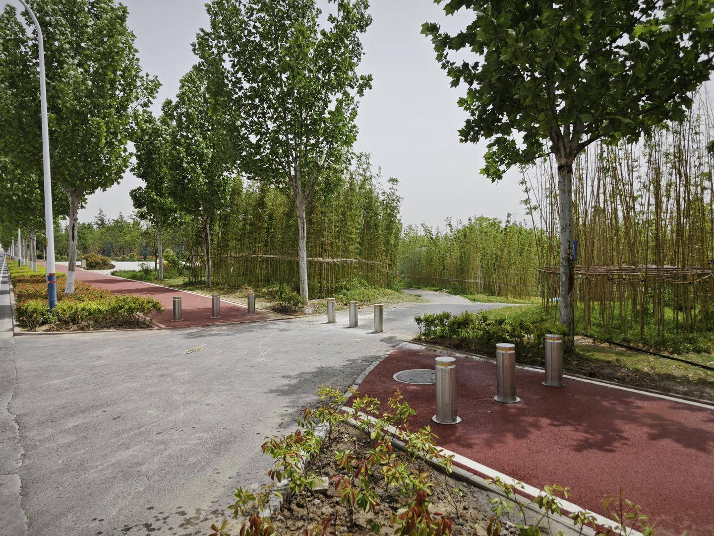 4月30日上午,红星新闻记者回访事发路段,事发路段电线杆上标有“港务河堤路”。记者发现小田骑行时遇到钢丝的分岔路口已经和视频里不一样了,没有铁皮围栏,也没有小田说的钢丝,路面上安装了隔离墩。