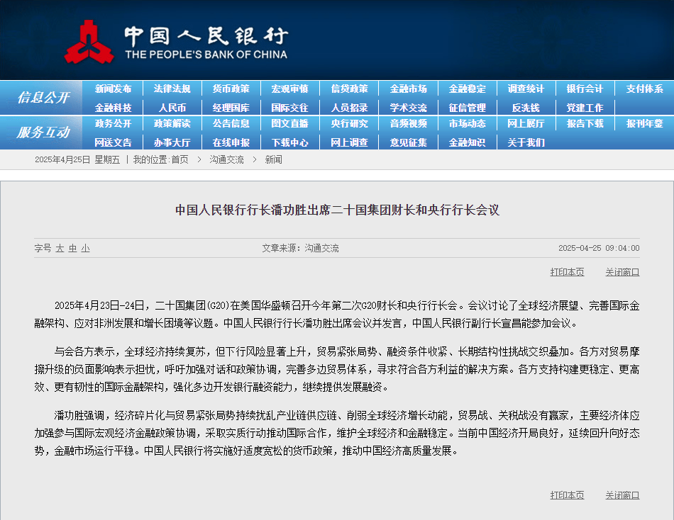 据央行网站4月25日消息,2025年4月23日~24日,二十国集团(G20)在美国华盛顿召开今年第二次G20财长和央行行长会。会议讨论了全球经济展望、完善国际金融架构、应对非洲发展和增长困境等议题。中国人民银行行长潘功胜出席会议并发言,中国人民银行副行长宣昌能参加会议。