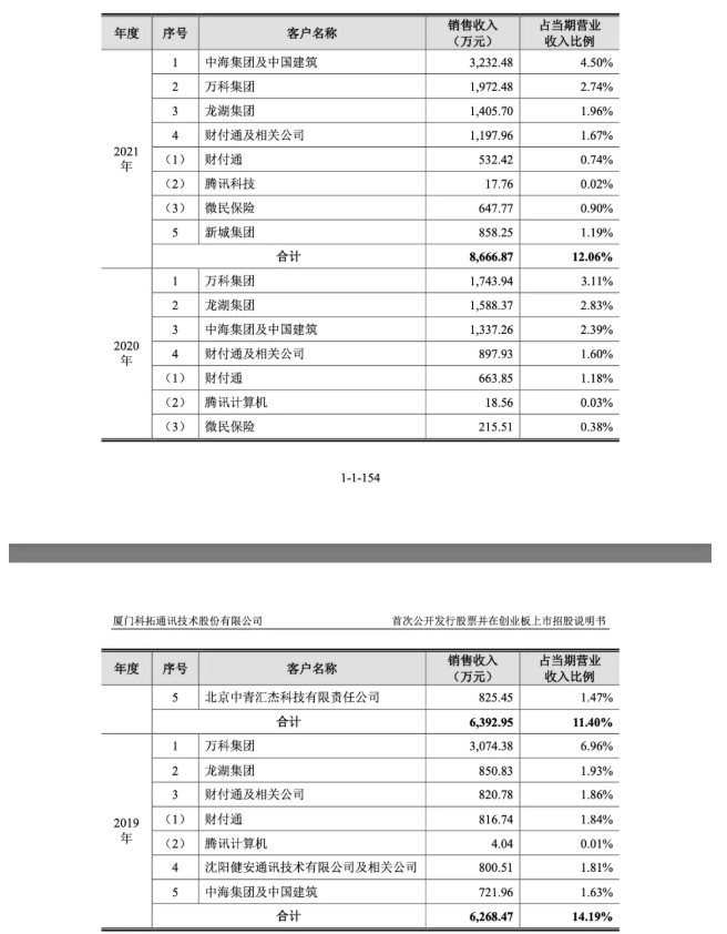 2019-2022年,腾讯旗下(财付通、腾讯计算机、腾讯科技、微民保险)通过相应市场推广活动,合计为科拓股份提供约820.78万、897.93万、1197.96万、1191.4万元销售收入,占当期总收入的比例分别为1.86%、1.60%、1.67%、1.8%,分别为第三、四、四、四大客户。