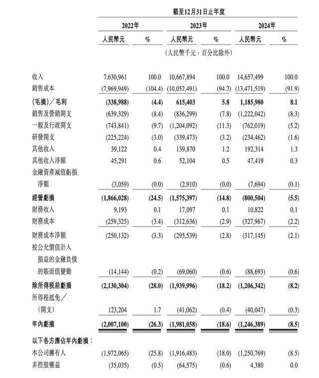 据招股书,2022年-2024年,曹操出行实现收入分别为76.31亿元、106.68亿元、146.57亿元;年内亏损分别为20.07亿元、19.81亿元、12.46亿元。可见,2024年其收入同比增长37.4%。