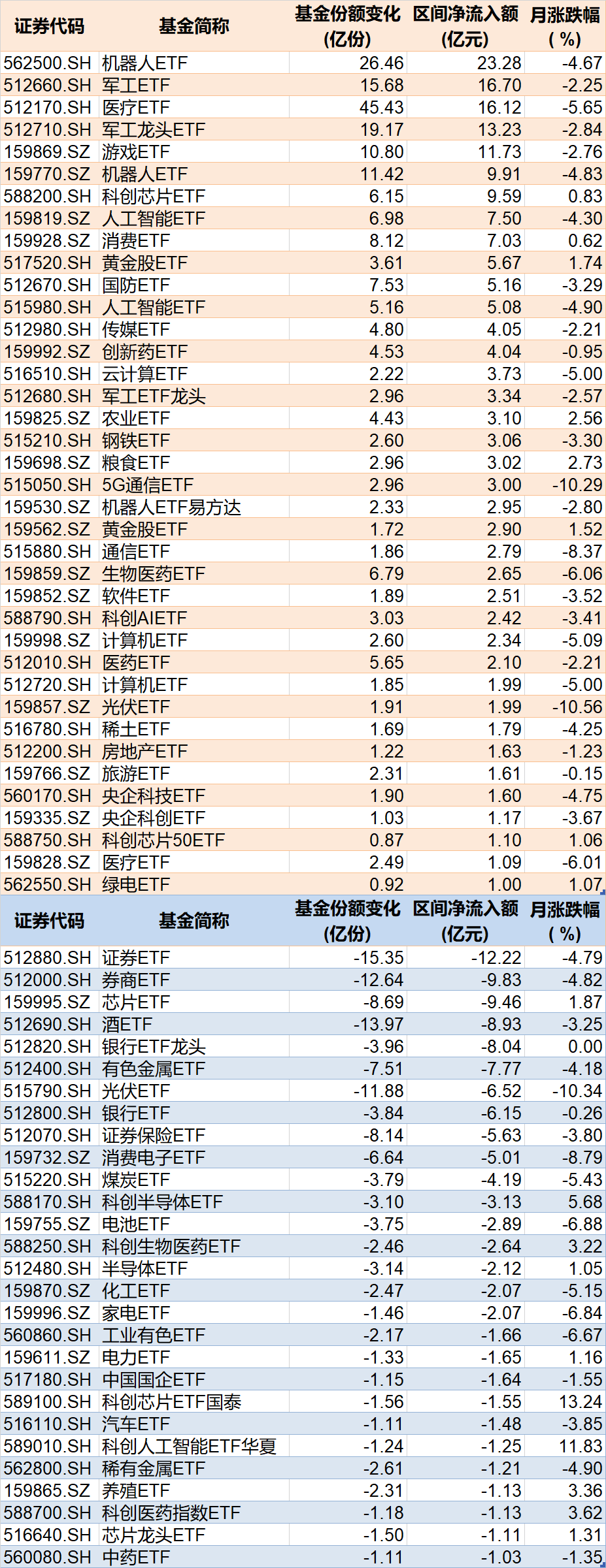 行业主题上看,机器人、军工、医疗相关ETF被资金看好,而券商、芯片相关ETF被资金抛售。
