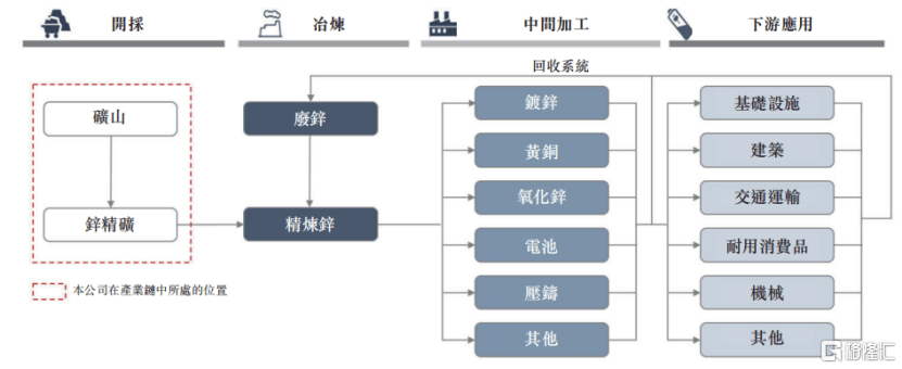 从行业来看,以锌行业价值链为例,锌矿石提炼后选矿成精矿,上游矿业公司一般向贸易商销售精矿,贸易商再转售给冶炼厂。冶炼厂会将精矿精炼成锭。下游企业进一步将锭加工成镀锌板、合金、氧化锌等产品。