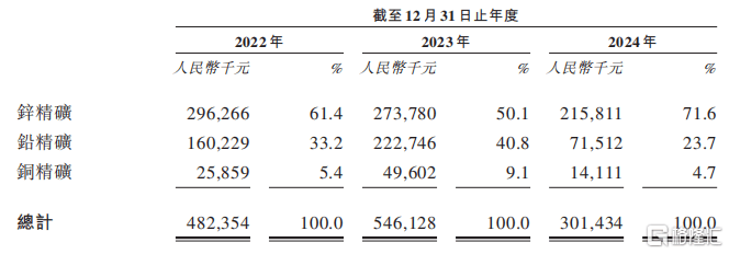 其中,锌精矿为公司主要的收入来源。各报告期,来自销售锌精矿的收入分别约为2.96亿元、2.74亿元及2.16亿元,分别占公司总收入约61.4%、50.1%及71.6%。