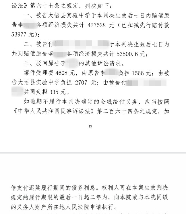 2025年4月8日,大悟县法院一审宣判称大悟县实验中学赔偿李同学各项经济损失共计42.75万余元(已扣减先行赔付款53977元),被告付同学一方共同赔偿李同学5.35万元,驳回原告李同学的其他诉讼请求。