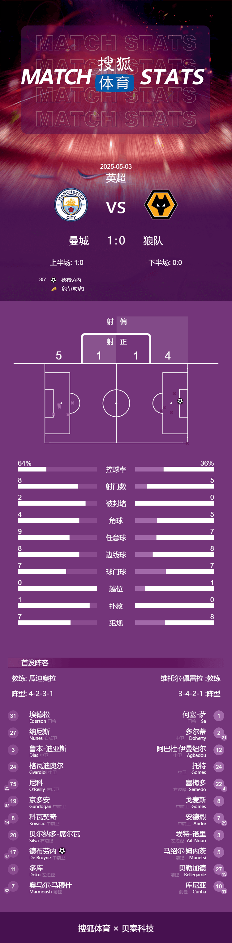 第35分钟,曼城前场抢断,多库左路突破后横传,德布劳内无人看守的情况下冷静推射得分,曼城1-0。