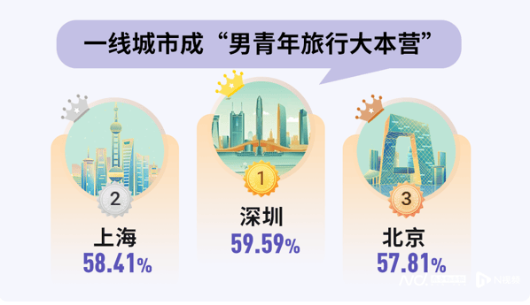 总体来看,男青年比女青年更爱出去玩,男青年出游占50.61%,女青年出游占49.39%。一线城市成为“男青年旅行大本营”,其中,深圳男青年以59.59%的出游比例稳坐榜首,上海和北京分别以58.41%、57.81%的比例位列二、三。