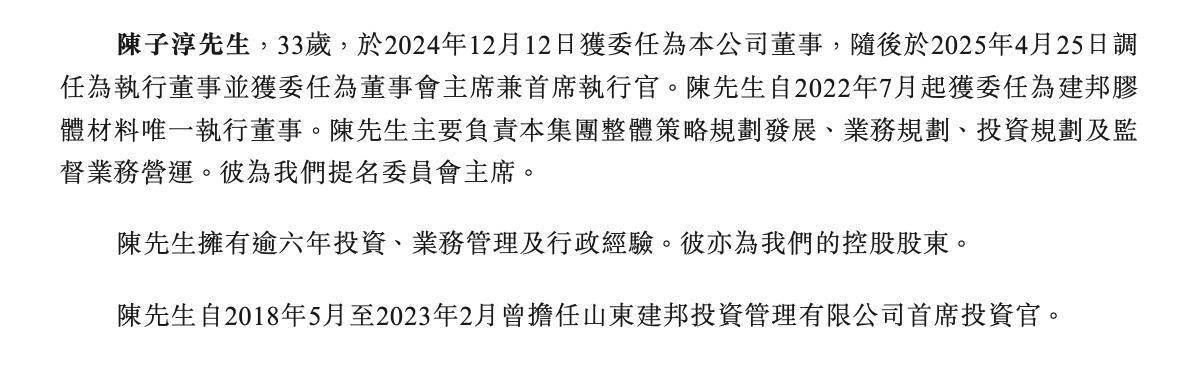 资料显示,陈子淳,现年33岁,于2024年12月12日获委任为公司董事,随后于2025年4月25日调任为执行董事并获委任为董事会主席兼首席执行官。陈子淳自2022年7月起获委任为建邦胶体材料唯一执行董事。其主要负责集团整体策略规划发展、业务规划、投资规划及监督业务营运。其为公司提名委员会主席。
